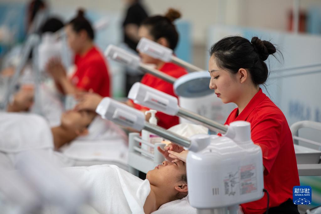 6月5日,在黑龍江省第一屆職業技能大賽現場,選手在參加美容比賽。