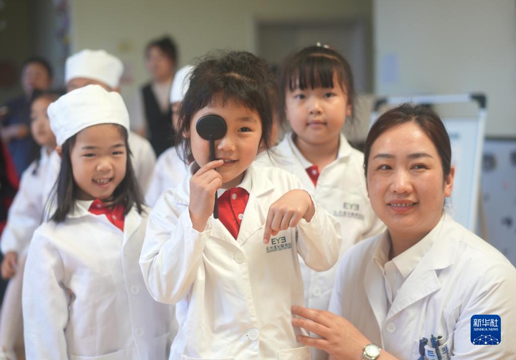 6月5日,浙江省湖州市長興縣開發區中心幼兒園,眼科醫生正在為孩子們檢查視力。