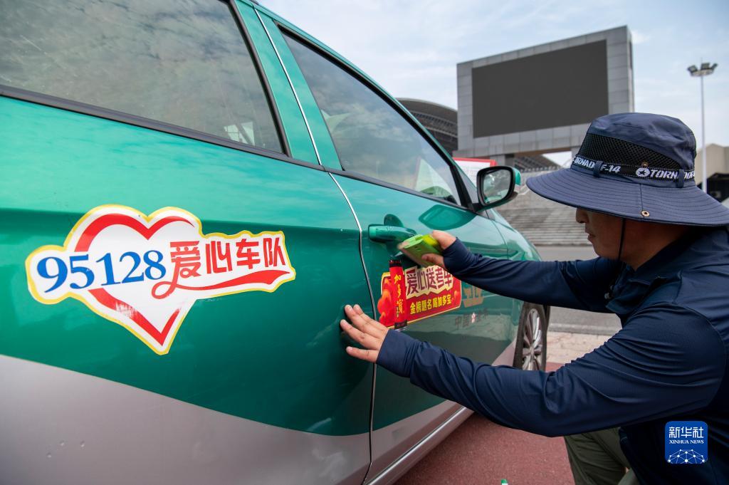 6月5日,在浙江省金華市體育中心廣場,出租車司機在張貼“愛心送考車”標識。