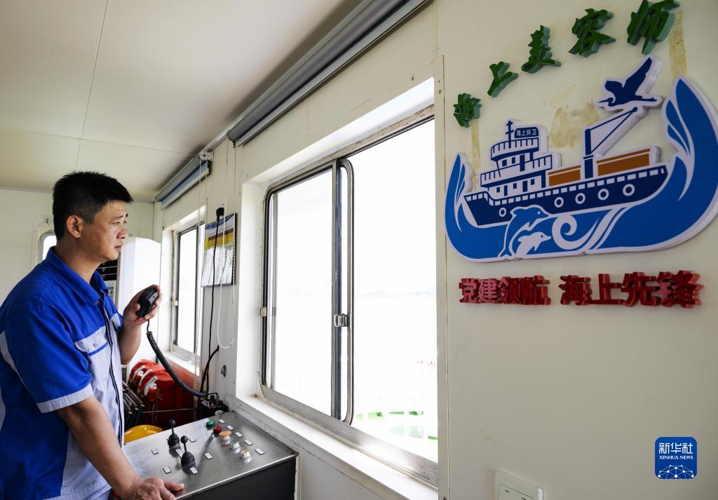 在廈門市廈鼓海域,海上環衛工人在對海漂垃圾進行機械化打撈清理(6月4日攝)。