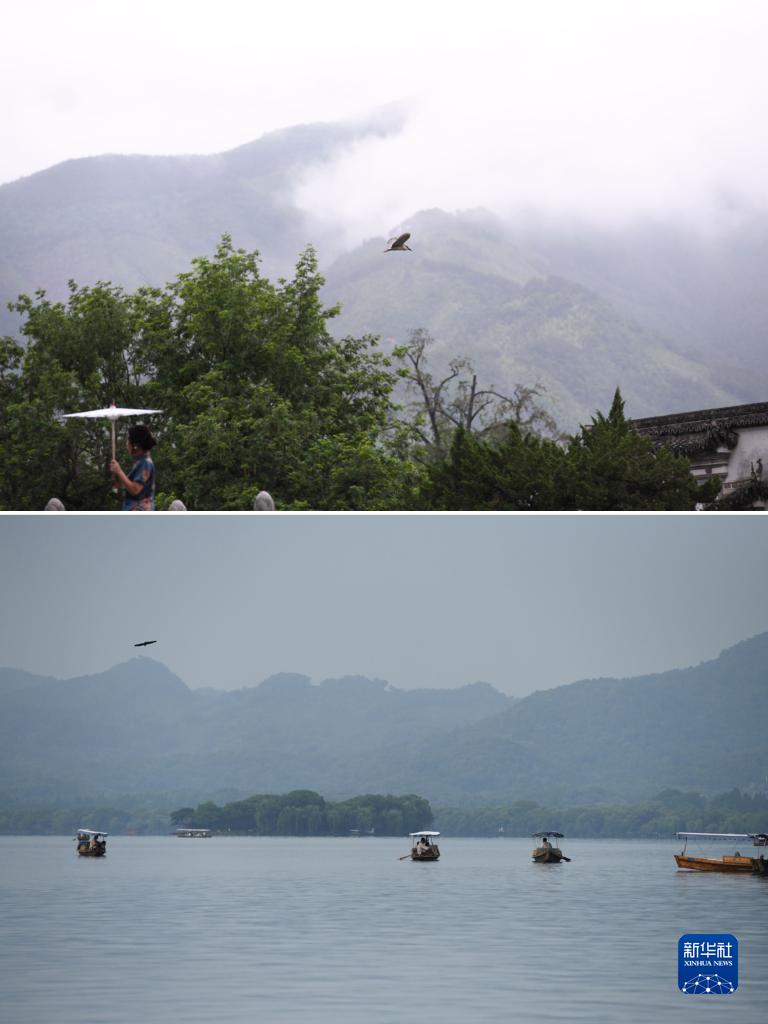 拼版圖片:上圖為5月31日拍攝的安徽省黃山市宏村風景(新華社記者 張端 攝);下圖為6月4日拍攝的浙江省杭州市西湖風景(新華社記者 黃宗治 攝)。