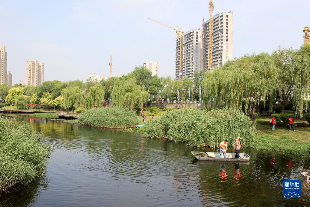 6月5日,環保志愿者在山東省棗莊市西沙河沿岸和河道清理垃圾雜物。