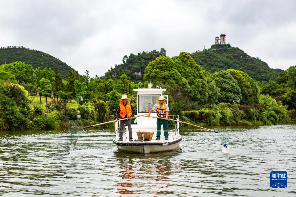 6月5日,環衛工人在貴州省安順市西秀區虹山湖打撈湖面漂浮物。