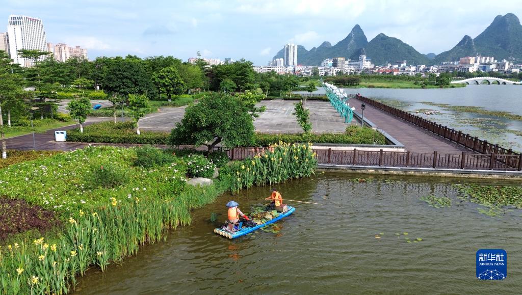 6月5日,廣西賀州市愛蓮湖公園環衛工人劃著竹筏打撈清理湖面漂浮物(無人機照片)。