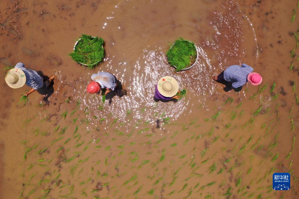 6月5日,江西省吉安市泰和縣澄江鎮新池村農民在田間拋秧。