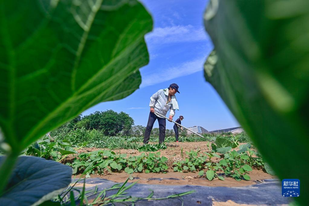 6月5日,農民在山東省青州市高柳鎮南馬蘭村一處葫蘆種植基地勞作。