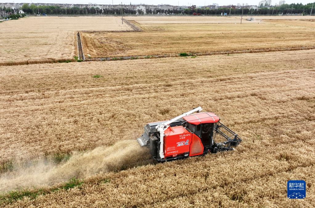 6月3日,在江蘇省太倉市雙鳳鎮勤力村,農機手駕駛收割機在田間搶收小麥(無人機照片)。