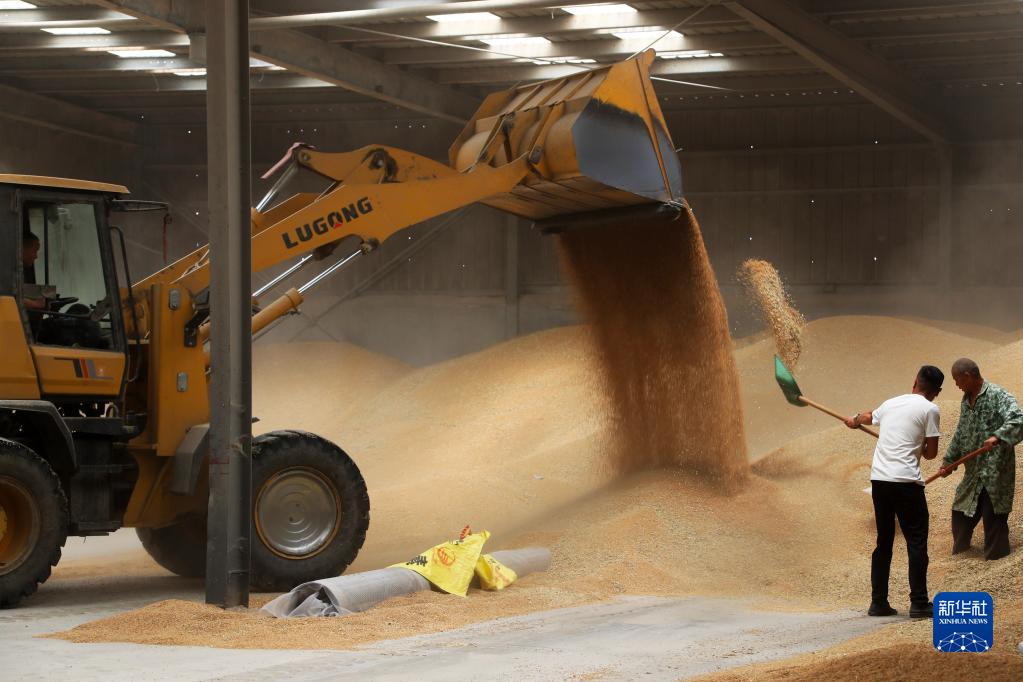 6月5日,在河南省許昌市建安區陳曹鄉雙廟村,工作人員將烘干后的小麥入庫。
