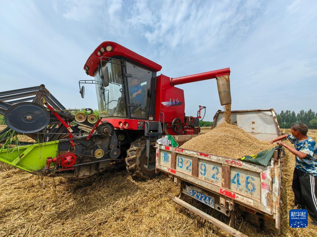 6月5日,在河南省開封市城鄉一體化示范區水稻鄉單寨村,農機手將收獲的小麥裝車。