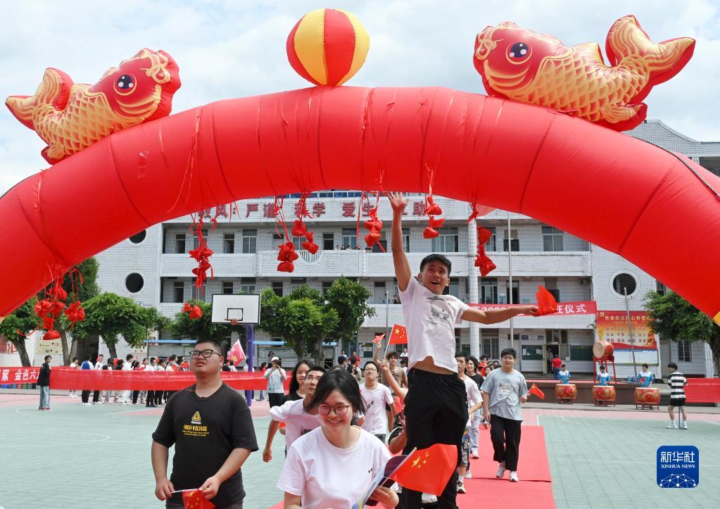 6月5日,四川省內江市第十三中學的高三學生沖過“得勝門”,希望能取得好成績。