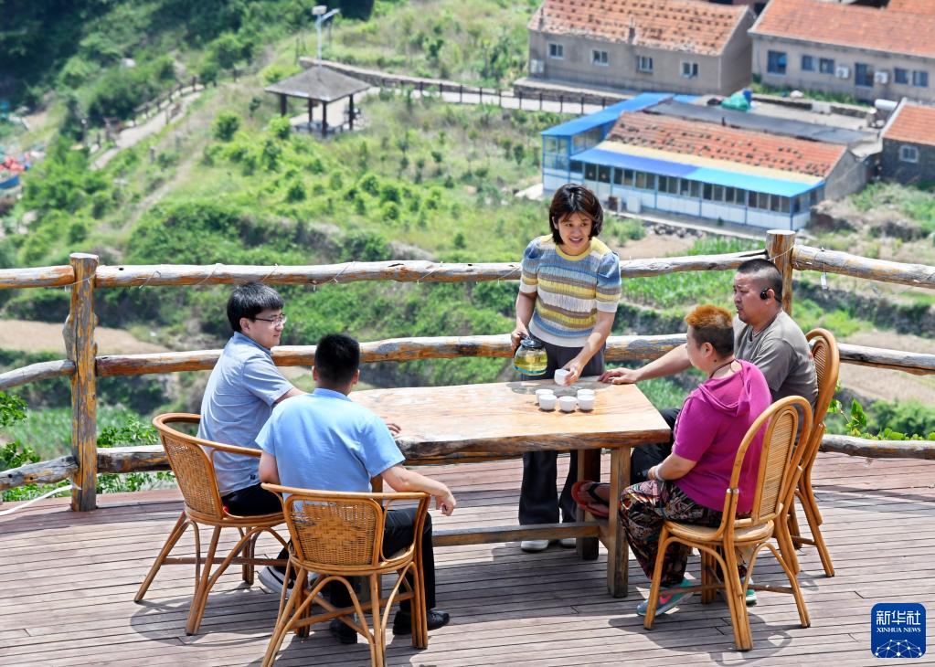 6月5日,游客在靈山島省級自然保護區一民宿飲茶休閑。
