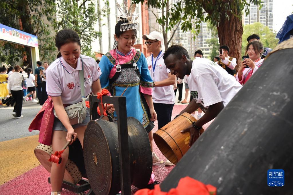 6月5日,參加三都高級中學第一屆國際文化節的來華留學生體驗敲擊銅鼓。