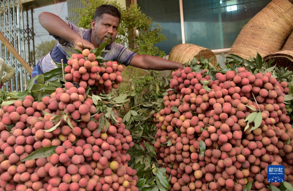 這是6月4日在孟加拉國迪納杰布爾市場中拍攝的待售的荔枝。