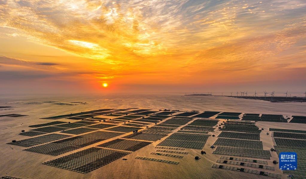 6月5日拍攝的朝霞映襯下的榮成市石島管理區桑溝灣海洋牧場生態網箱養殖區(無人機照片)。