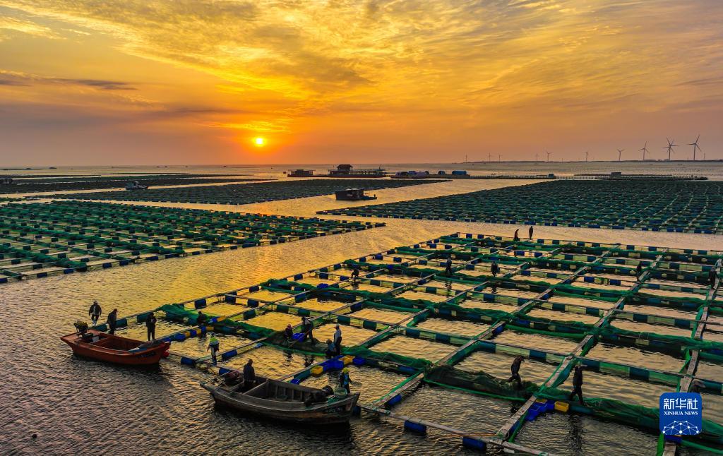 6月5日,在榮成市石島管理區桑溝灣海洋牧場生態網箱養殖區,漁民在進行海上養殖作業(無人機照片)。