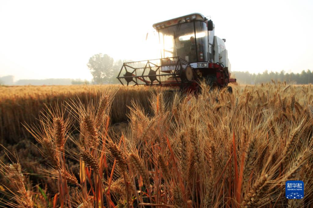 6月6日,在山東省臨沂市平邑縣地方鎮大廣良村,農機手駕駛收割機在收割小麥。