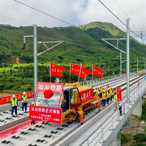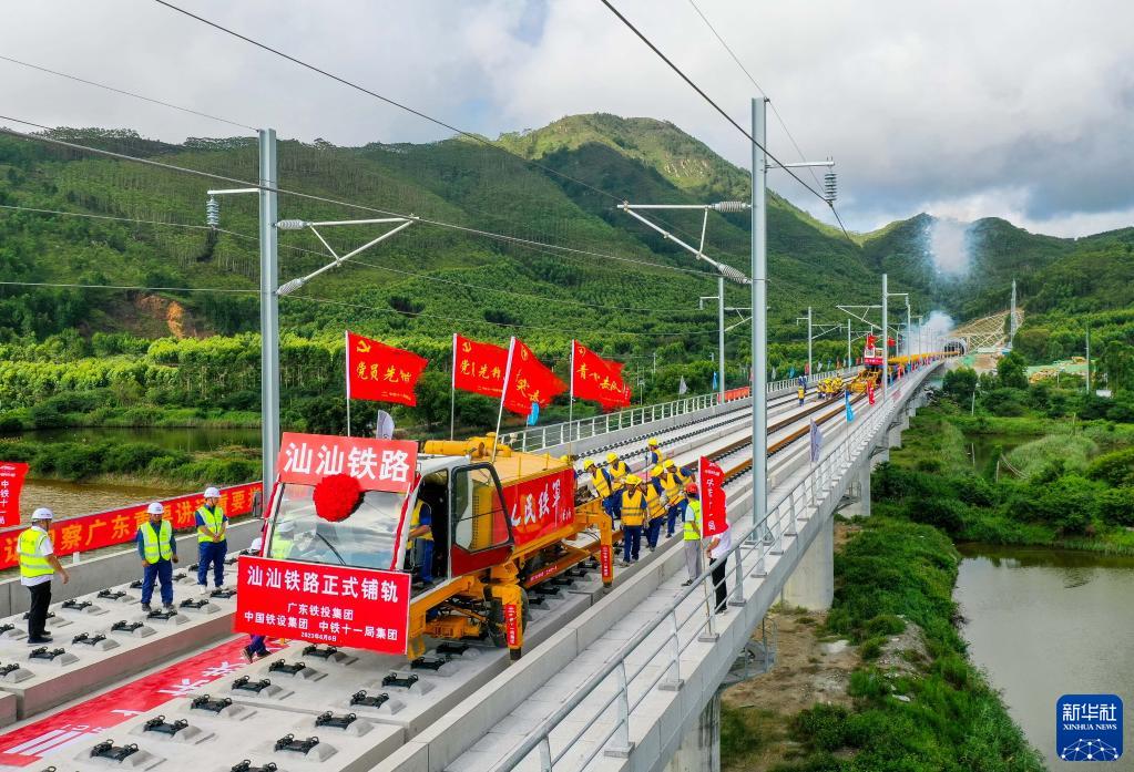 當日,中鐵十一局鋪軌機組在汕(尾)汕(頭)鐵路汕尾螺河特大橋上鋪設一對500米長鋼軌,汕汕鐵路進入全線鋪軌階段。