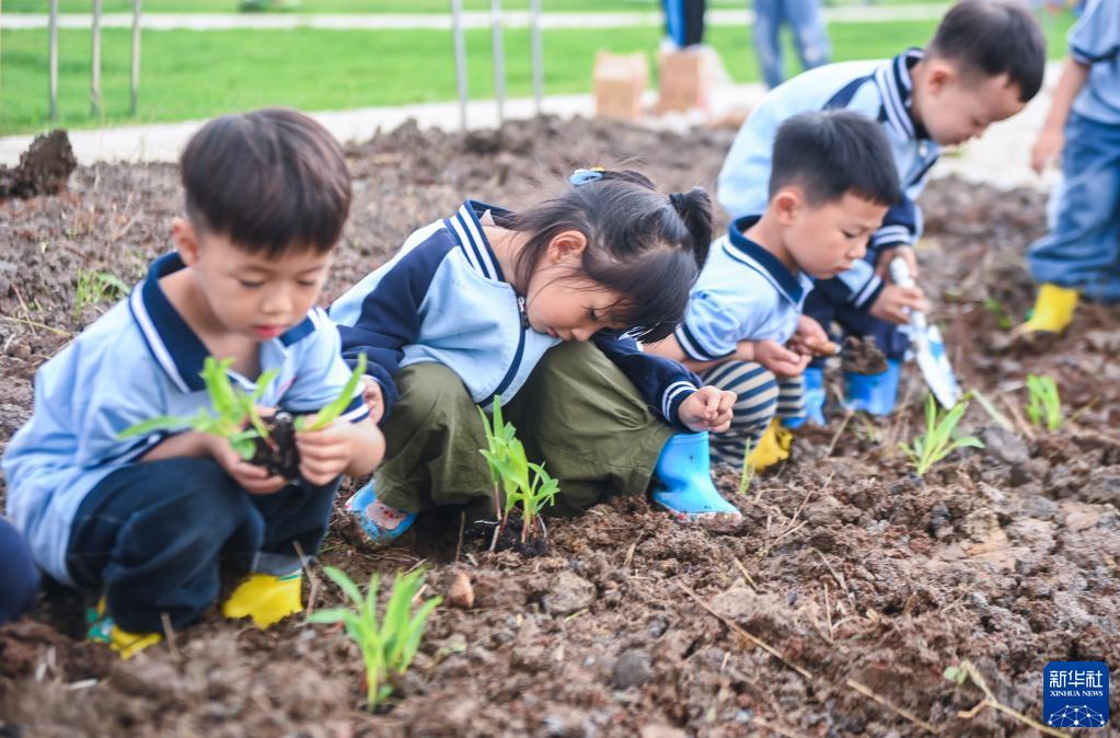 6月6日,孩子們在幼兒園的“農耕園”里跟著老師一起種玉米苗。