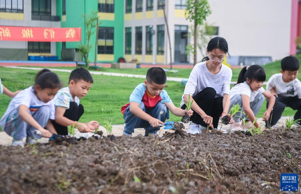 6月6日,孩子們在幼兒園的“農耕園”里跟著老師一起種玉米苗。