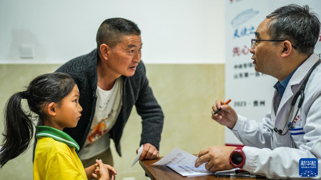 6月6日,在關嶺布依族苗族自治縣中醫醫院,山東第一醫科大學附屬中心醫院的醫療專家為小朋友做完檢查后和家長溝通。