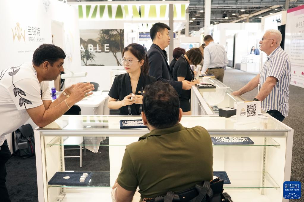 6月2日,在美國拉斯維加斯珠寶展上,珠寶業內人士參觀中國公司寶銳特的展區。
