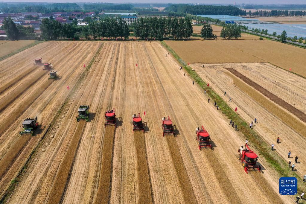 6月6日,農機手駕駛收割機進行機收減損比武競賽(無人機照片)。