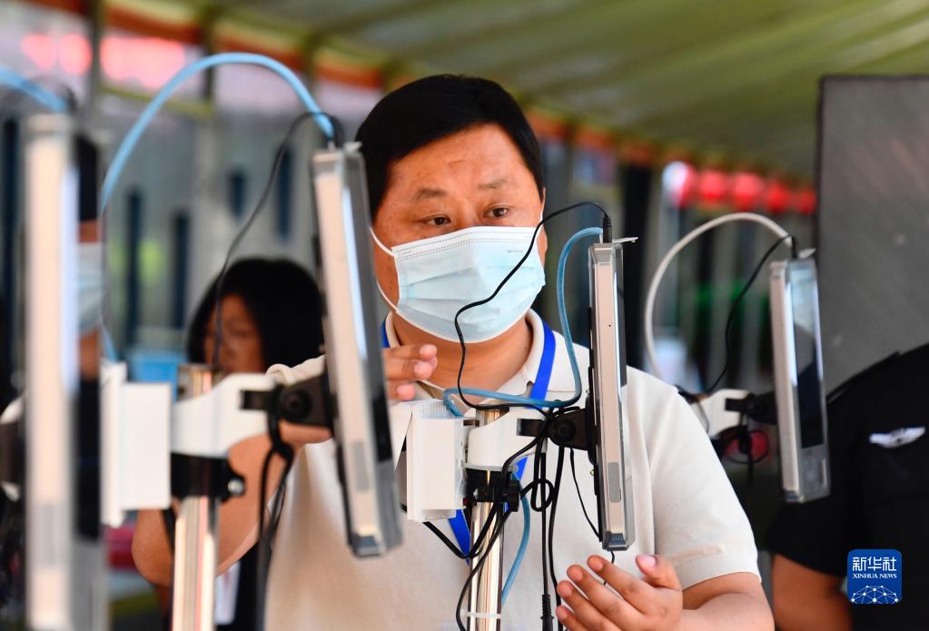 6月6日,北京育英中學工作人員在檢查高考入校識別設備。