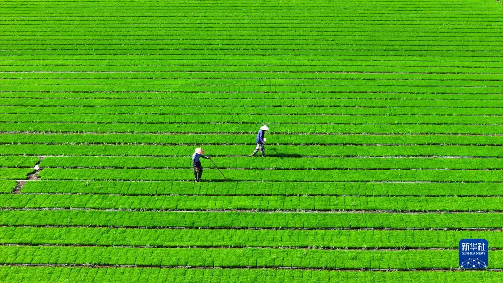 6月6日,江蘇省淮安市洪澤區岔河鎮東陳村農民在育秧基地管護秧苗(無人機照片)。