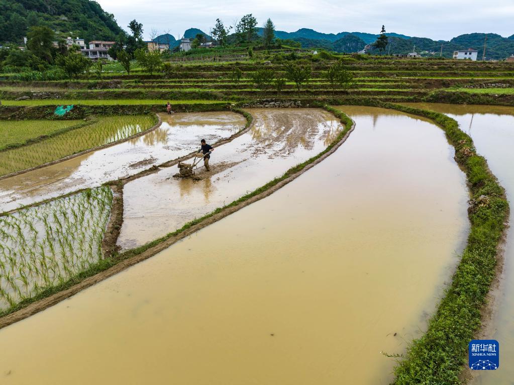 6月6日,農民在貴州省安順市西秀區七眼橋鎮九龍屯村翻耕水稻田(無人機照片)。