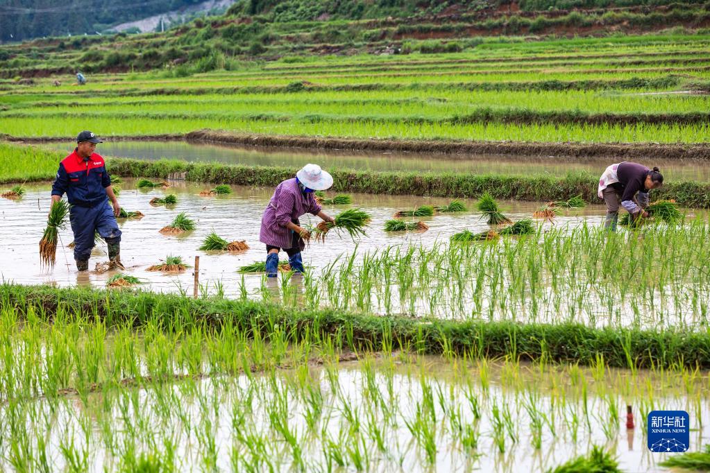 6月6日,農民在貴州省安順市西秀區七眼橋鎮九龍屯村水稻田插秧。