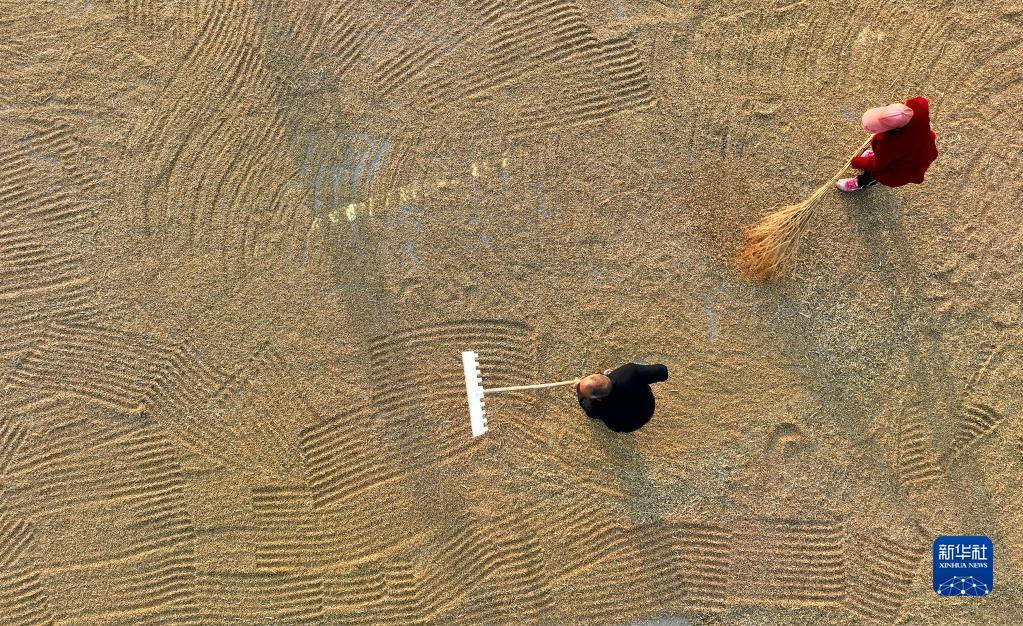 6月6日,陜西省渭南市合陽縣洽川鎮南義社區農民在晾曬小麥(無人機照片)。