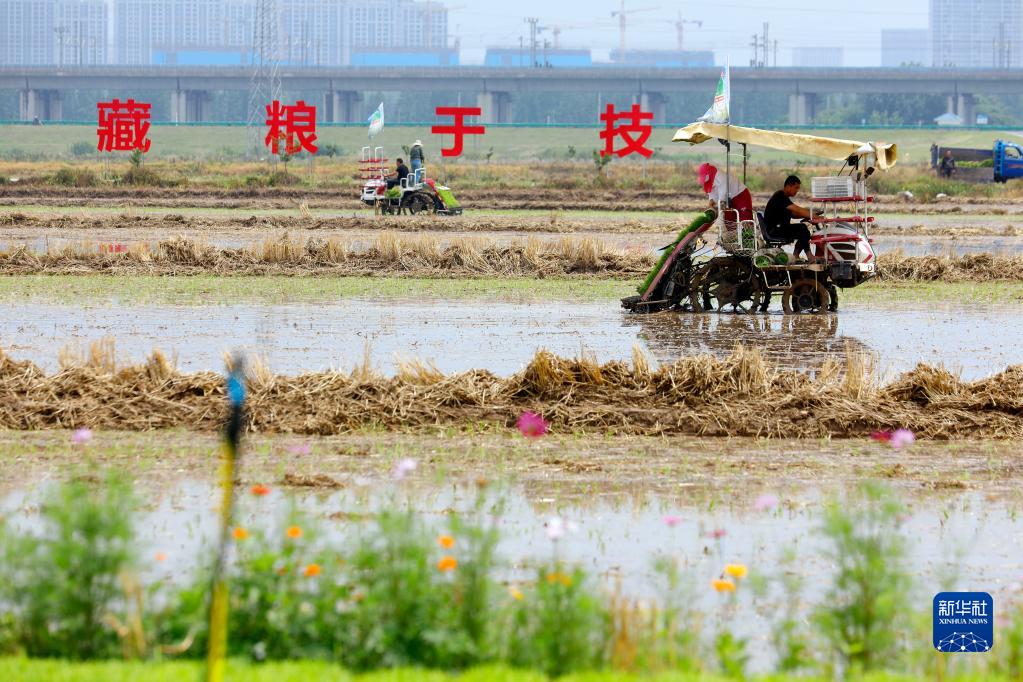6月6日,農民在江蘇省南京市橋林街道蘭花塘水稻種植片區里插秧。