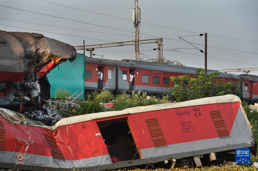 6月5日,在印度東部奧迪沙邦巴拉索爾地區,一列火車駛過列車相撞事故路段。