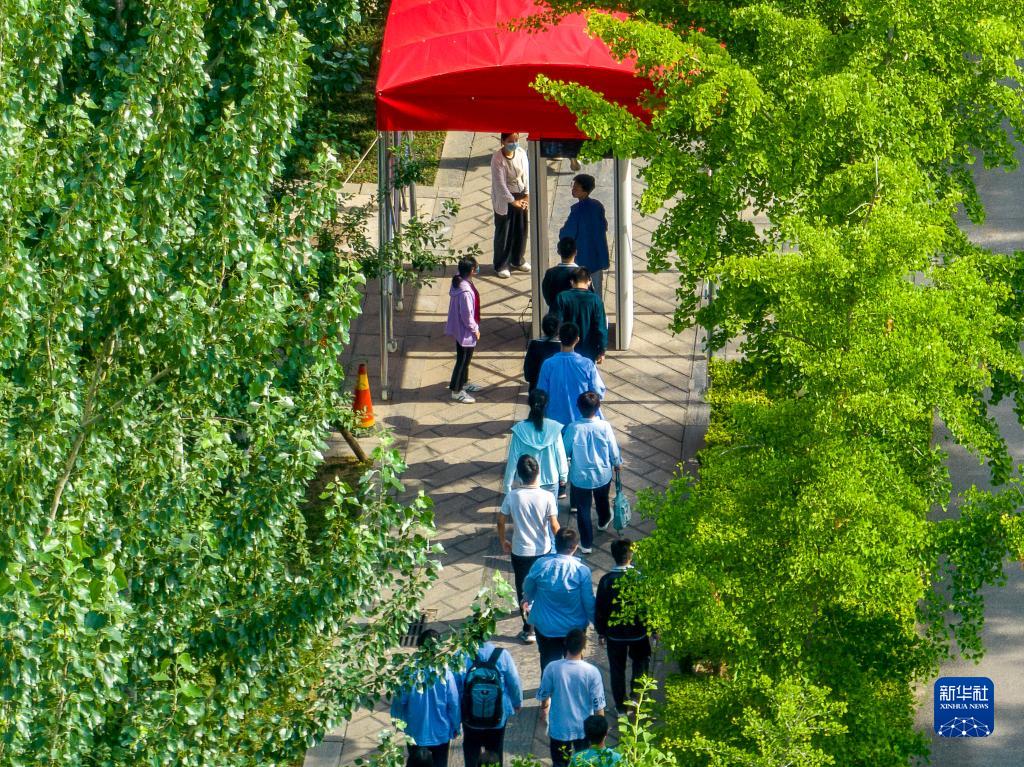 6月6日,河南省安陽市考生在一考點排隊通過智能安檢門模擬入場(無人機照片)。