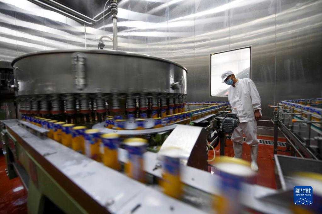6月6日,在承德縣一家杏仁深加工企業灌裝車間,工人在查看灌裝完成的杏仁露。
