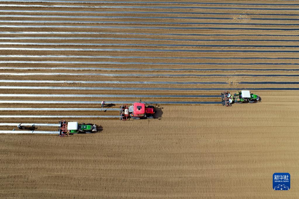 6月6日,農機在鄂托克前旗城川鎮麻黃套村的辣椒種植基地里作業(無人機照片)。