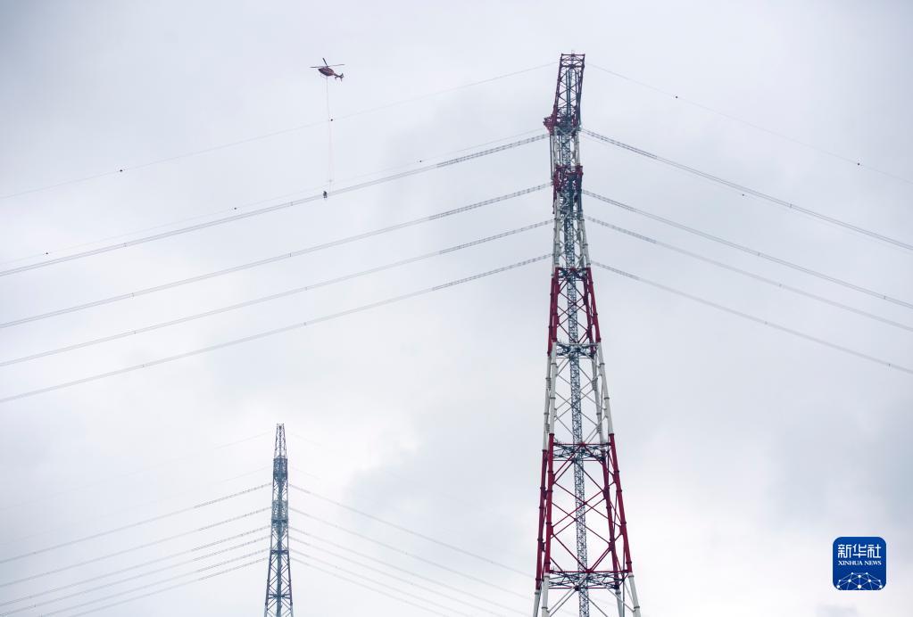 6月6日,在安徽蕪湖的長江邊,直升機將檢修人員吊送至±800千伏建蘇線上進行帶電作業。