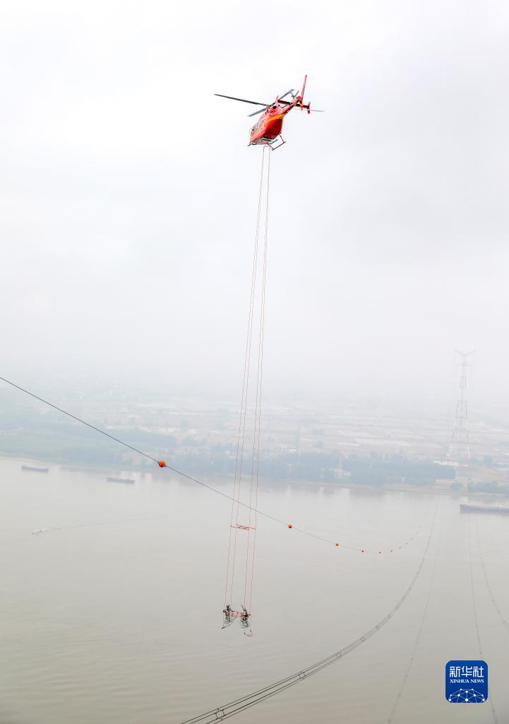 6月6日,在安徽蕪湖的長江邊,直升機將檢修人員吊送至±800千伏建蘇線上進行帶電作業。