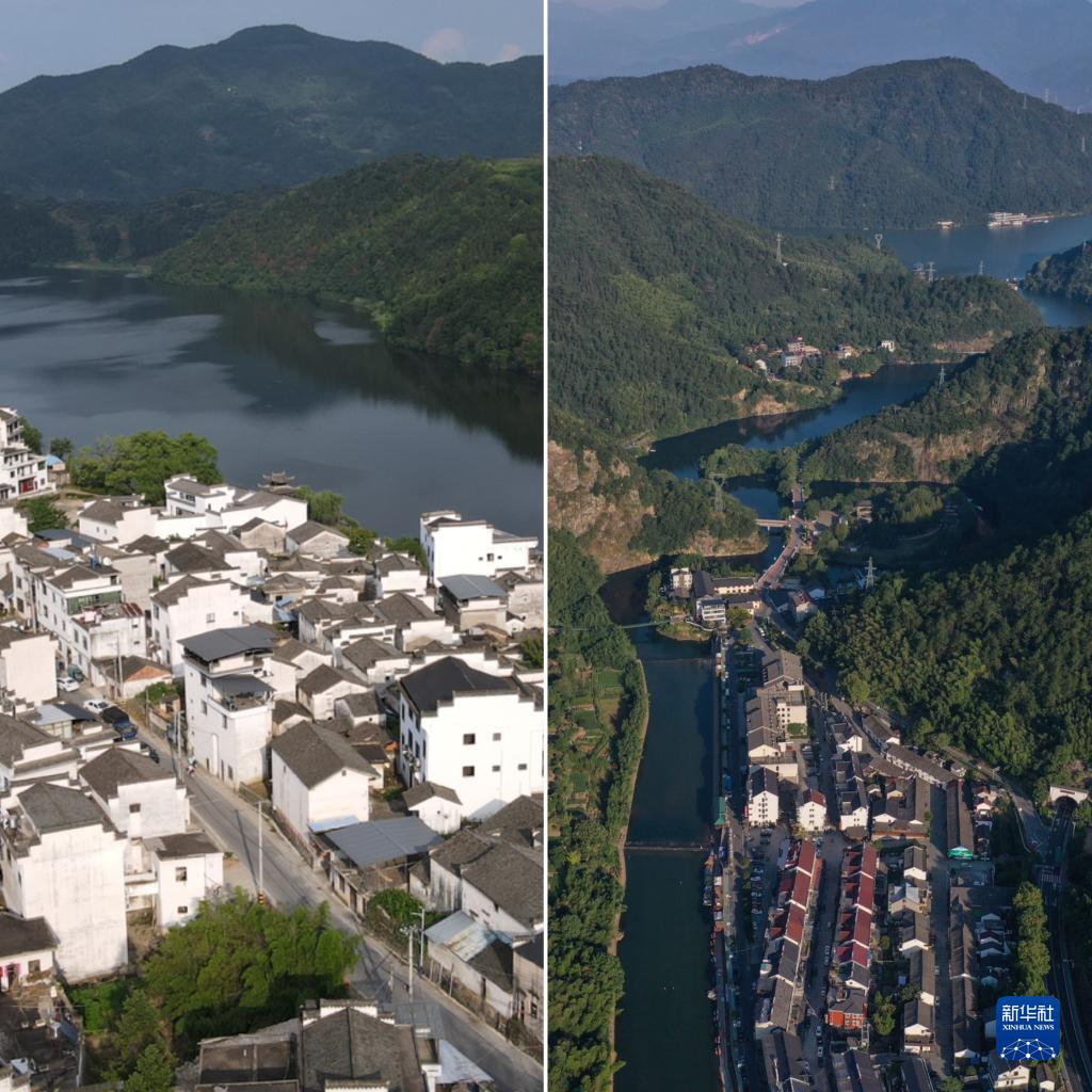 拼版照片:左圖為6月1日拍攝的安徽省黃山市歙縣新安江風景(新華社記者張端攝);右圖為2020年9月6日拍攝的浙江省桐廬縣蘆茨村一景(無人機照片,新華社記者黃宗治攝)。