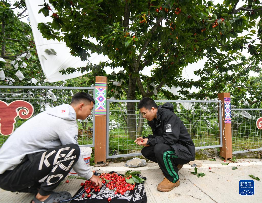 在四川省阿壩州汶川縣蘿卜寨村,王光強(右)和村民商量櫻桃收購價格(6月2日攝)。