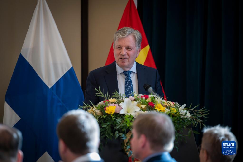 6月5日,芬蘭前總理埃斯科·阿霍在芬蘭赫爾辛基舉辦的以“回顧中芬互利合作70年,攜手面向未來”為主題的研討與慶?;顒蝇F場發言。