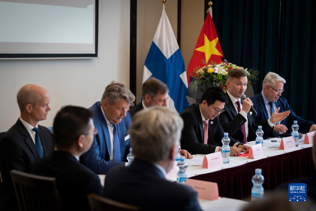 6月5日,芬蘭通力集團副董事長尤西·赫林(右二)在芬蘭赫爾辛基舉辦的以“回顧中芬互利合作70年,攜手面向未來”為主題的研討與慶?;顒蝇F場發言。