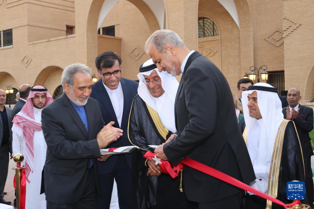 6月6日,在沙特阿拉伯利雅得,伊朗副外長比格德利(前)、沙特副外交大臣優素福(中)等出席伊朗駐沙特阿拉伯大使館復館儀式。