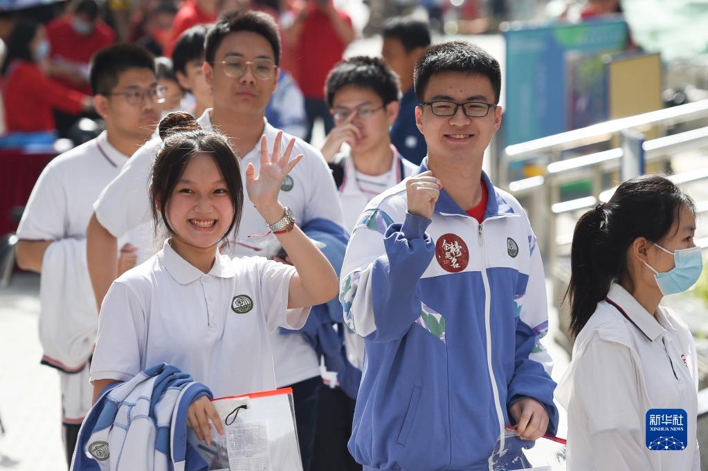 6月7日,在北京市陳經綸中學考點,考生在排隊進入考點時向家長和老師致意。