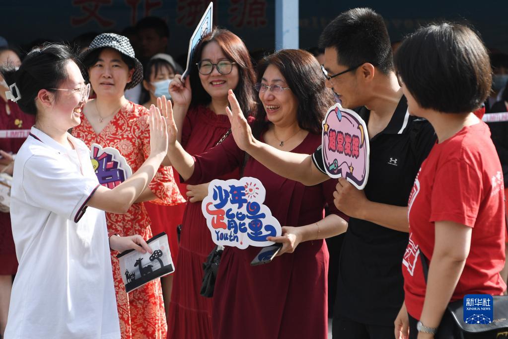 6月7日,在北京市陳經綸中學考點,送考老師為考生加油鼓勁。