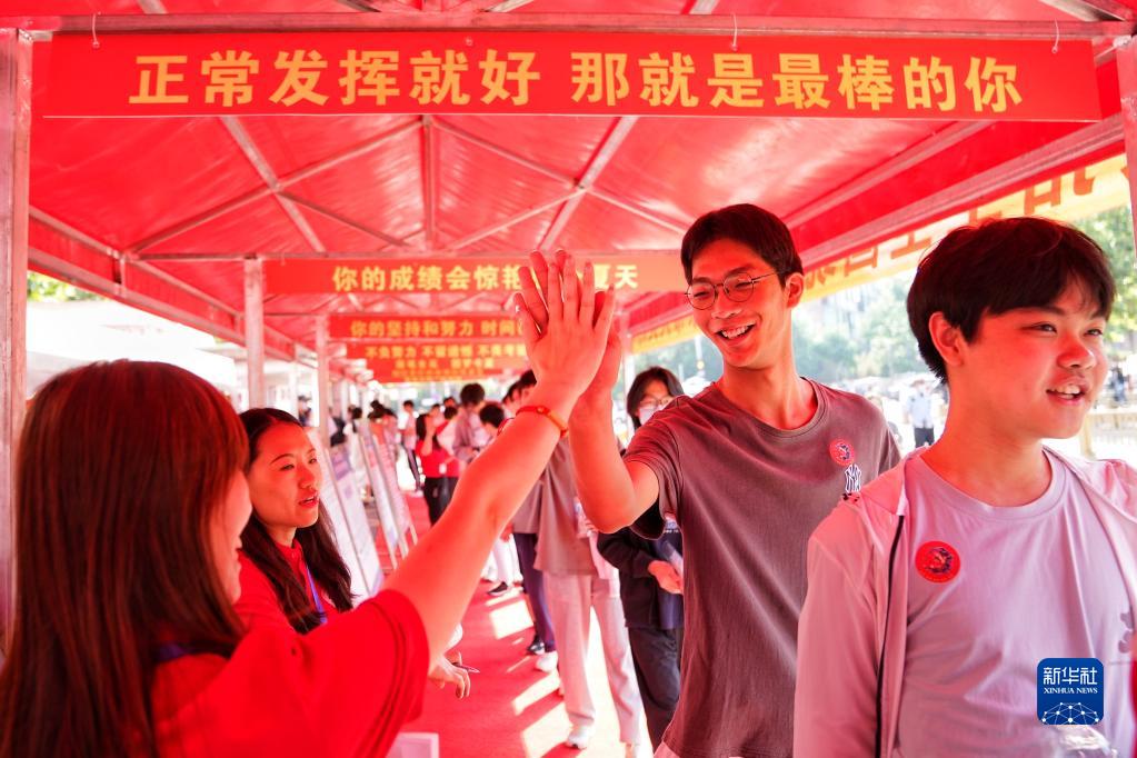 6月7日,在北京人大附中經開學??键c,送考老師與一位考生擊掌,為他加油鼓勁。
