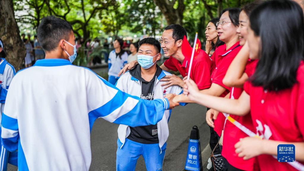 6月7日,考生在貴陽市烏當中學考點和送考老師互動。