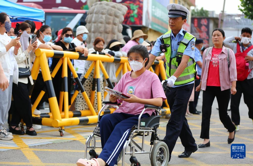 6月7日,在山東省滕州市第二中學考點,一名行動不便的考生在警察幫助下進入考場。