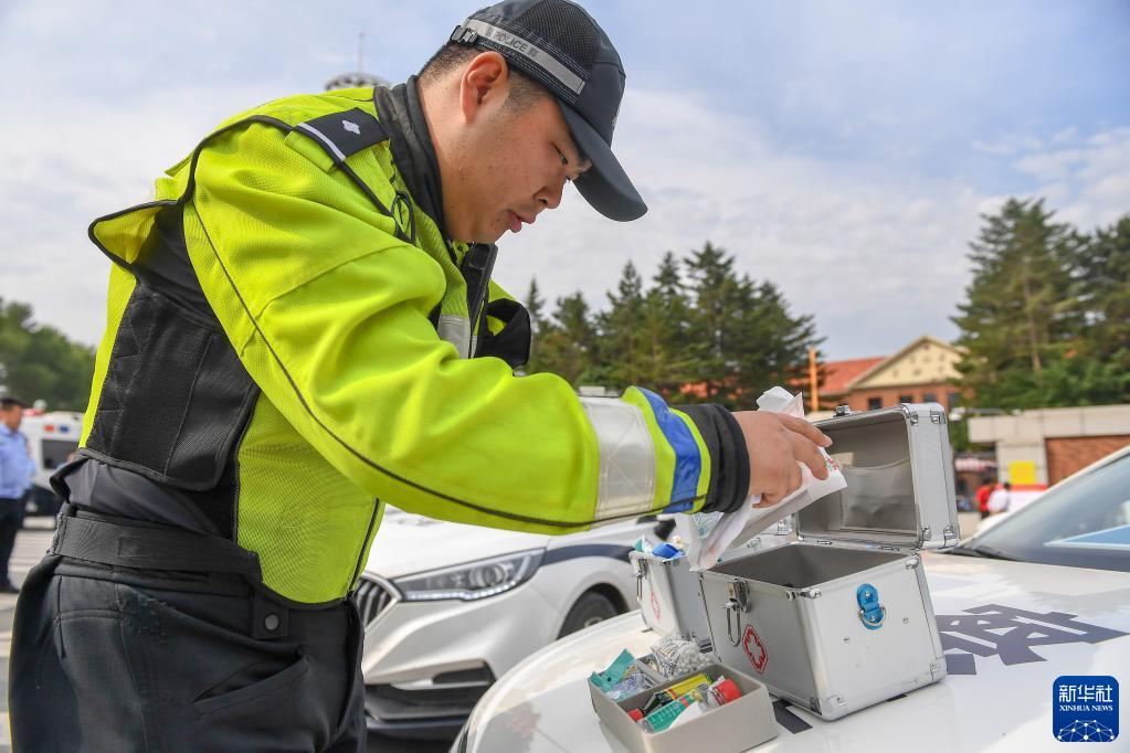 6月7日,在位于吉林省長春市的吉林省實驗中學考點外,交警準備應急藥箱供考生、家長使用。