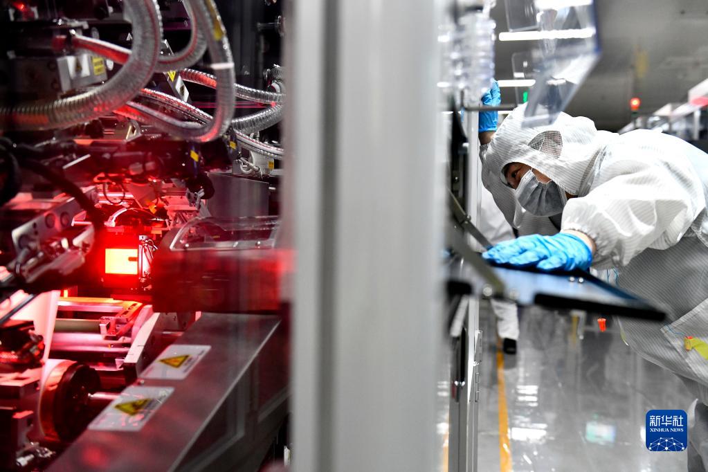 6月6日,在山東吉利欣旺達動力電池有限公司,工作人員在鋰電池生產線值守。